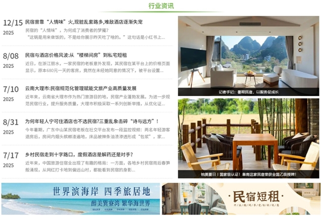 登录酒店民宿平台,呈现在眼前的包括行业资讯、供应信息、求购信息、企业名录、市场行情、招商加盟、行业展会和人才招聘等功能模块,囊括了酒店企业、民宿企业、商务酒店、度假酒店、会展酒店、主题酒店、疗养酒店、城市酒店、汽车旅馆、古镇民宿、海景酒店、单体酒店、连锁酒店、民宿集群、酒店用品和酒店服务等产品分类。作为连接房源供给与消费需求的核心渠道,对旅游业、地方经济及经营者将产生深远影响,为经济与地方发展提供推动力,酒店民宿平台通过吸引游客消费,提升地方知名度和经济活力,尤其在旅游资源丰富的地区,民宿收入将成为居民重要经济来源。平台为创业者提供低投入、高回报的机会,闲置房产可通过出租实现资产增值,平台将为民宿带来巨大流量,通过专业推广策略提升房源曝光度,吸引中高端客源,用户可通过平台直接沟通房东,简化预定流程,提升便捷性。